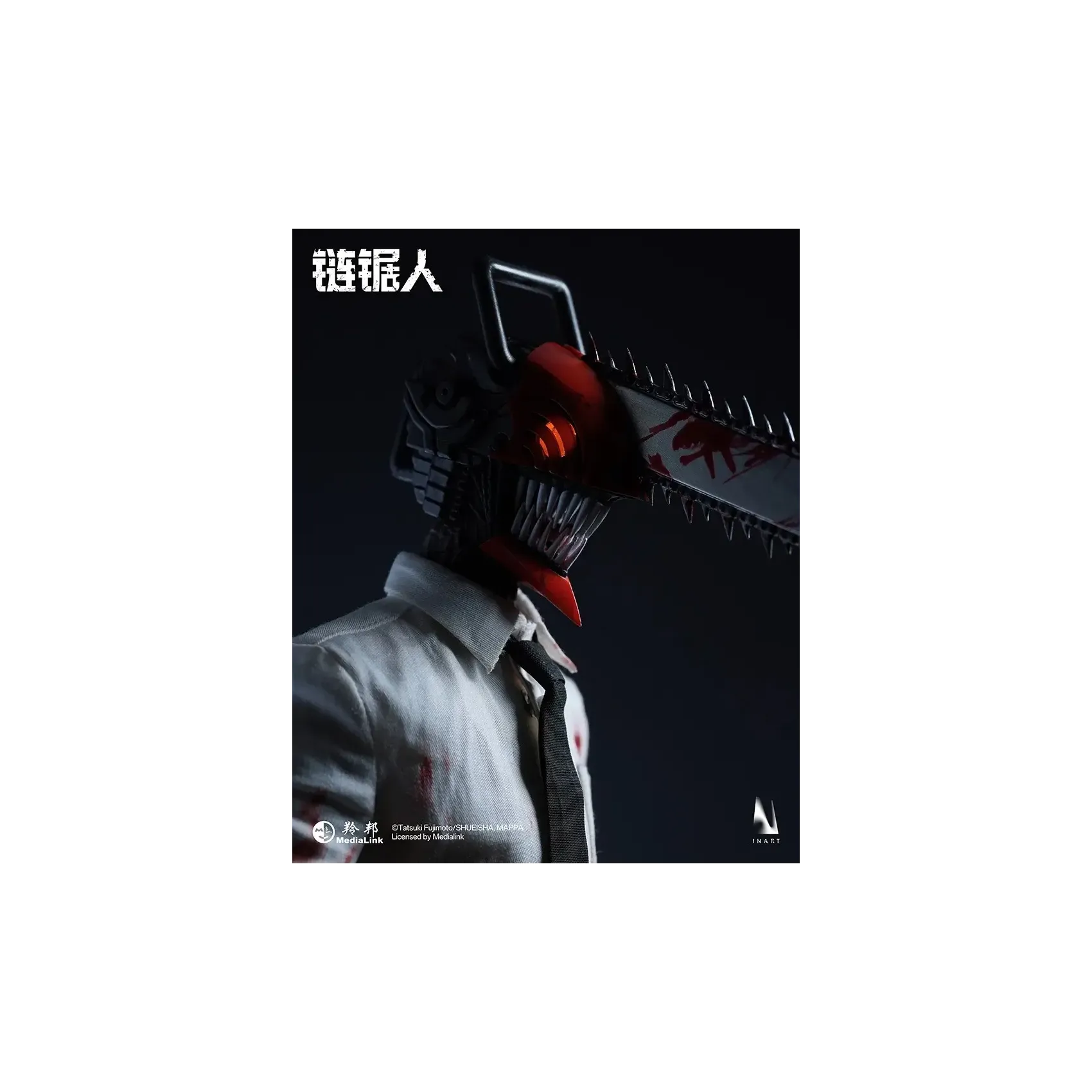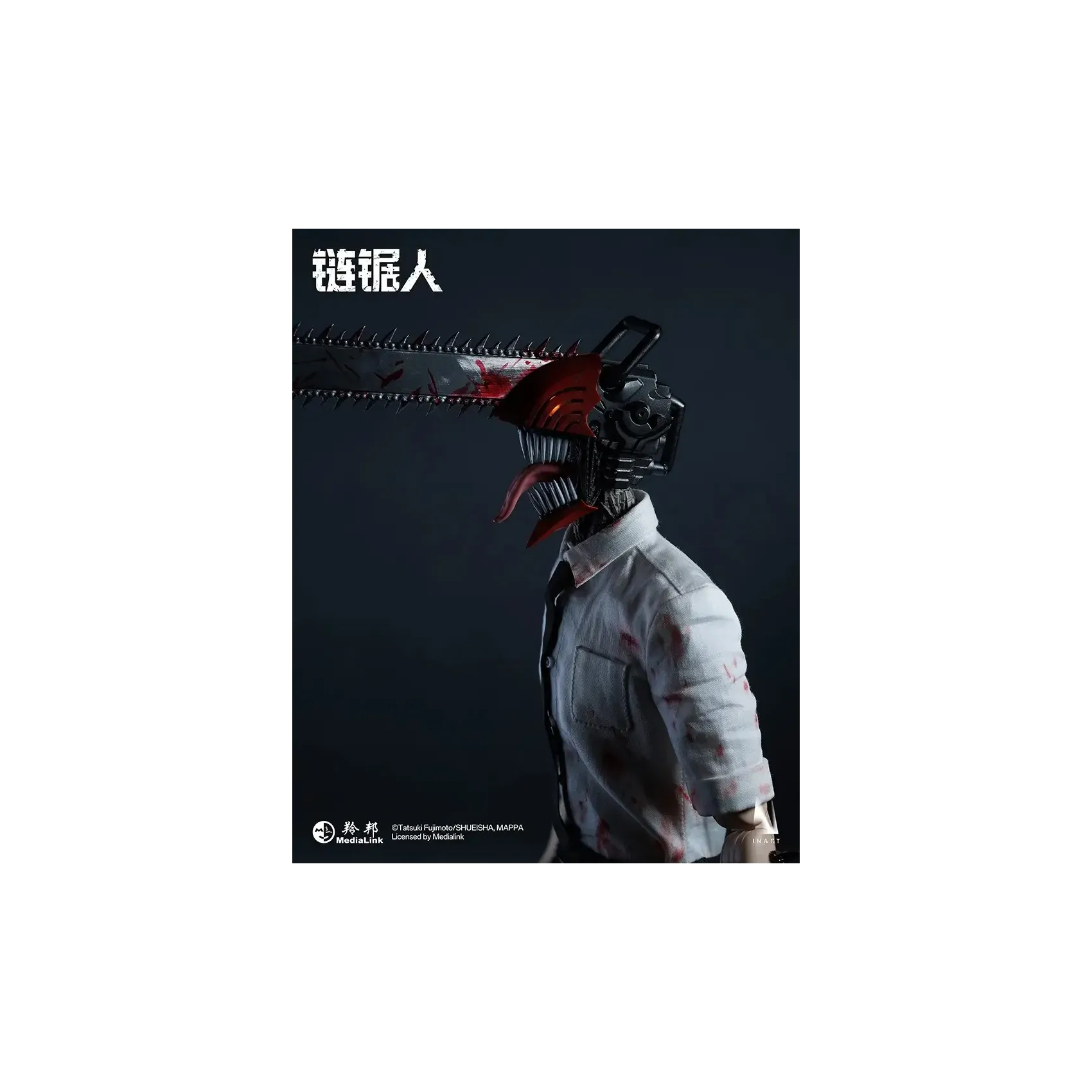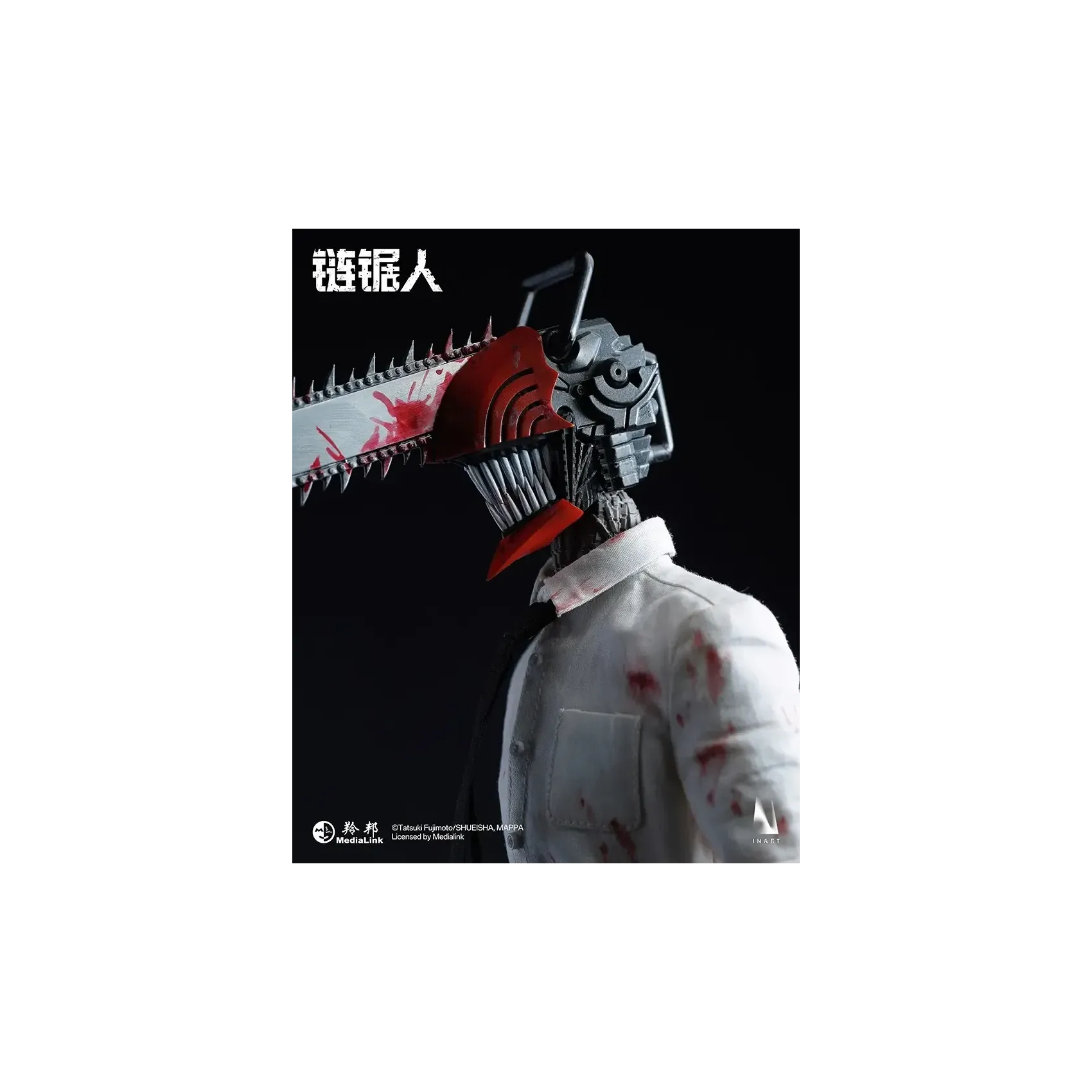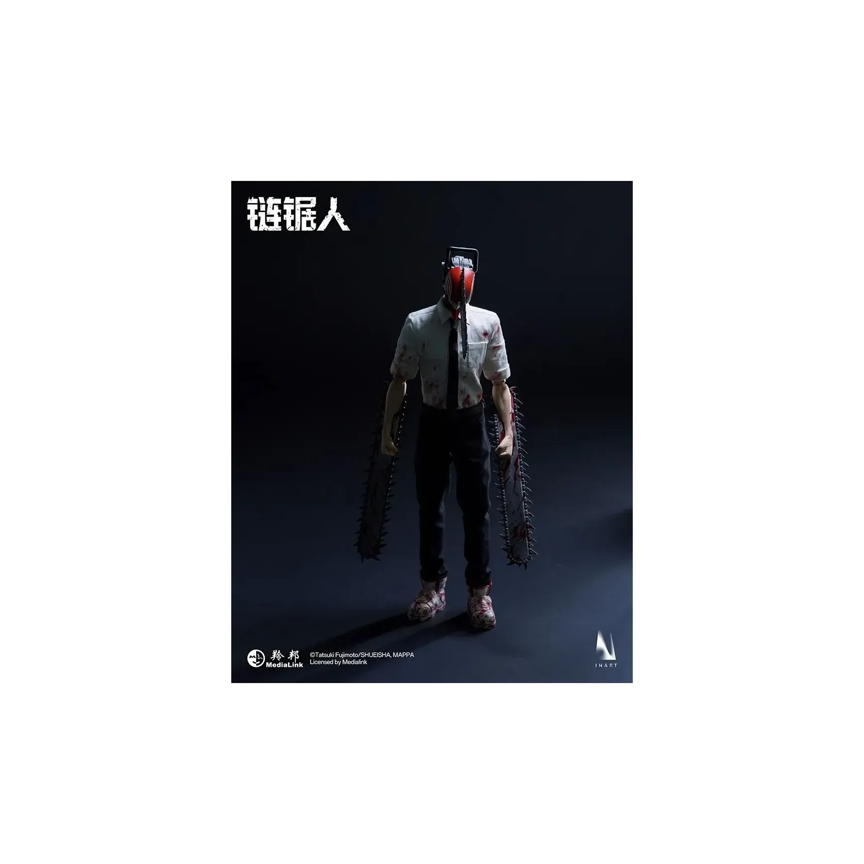 INART poseable body*1, magnetic light-up chainsaw head*1, blood-stained shirt*1, tie*1, pants*1, shoes*1 pair, interchangeable short mandible*1, interchangeable long mandible*1, open chainsaw hands*1 pair, clenched chainsaw hands*1 pair, magnetic blood effect head piece*1, blood effect head piece*1, blood effect hand pieces*2, metal stand*1, base*1.