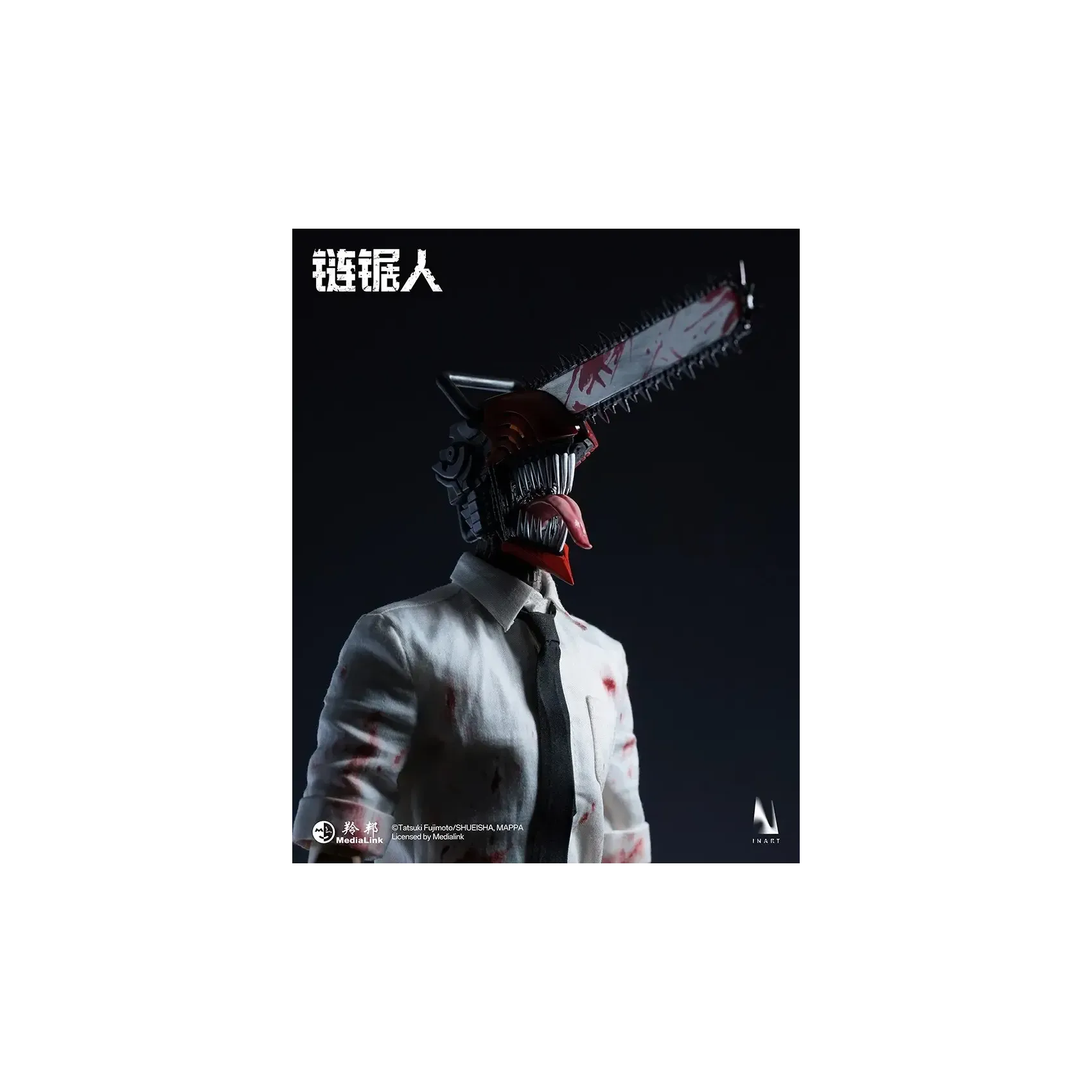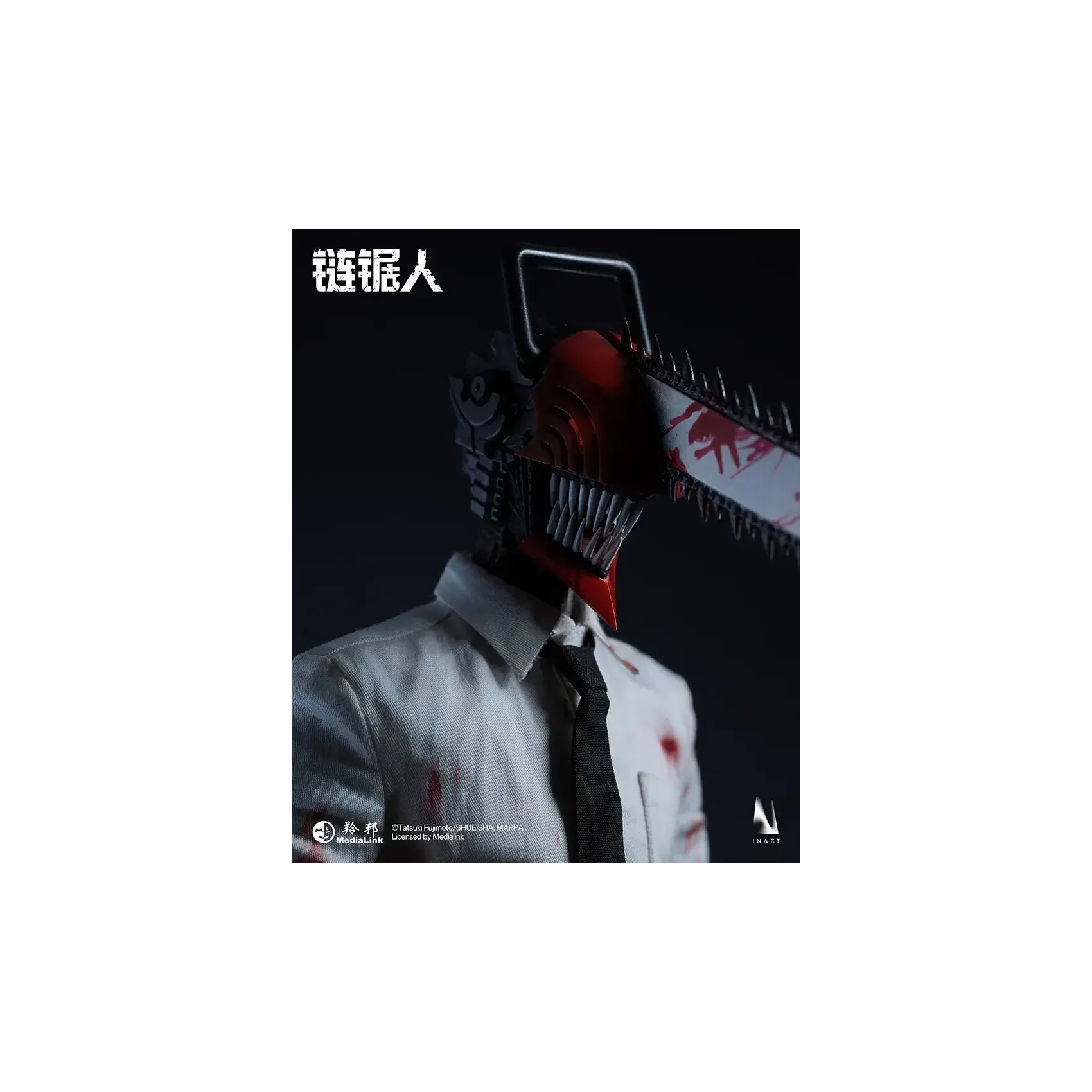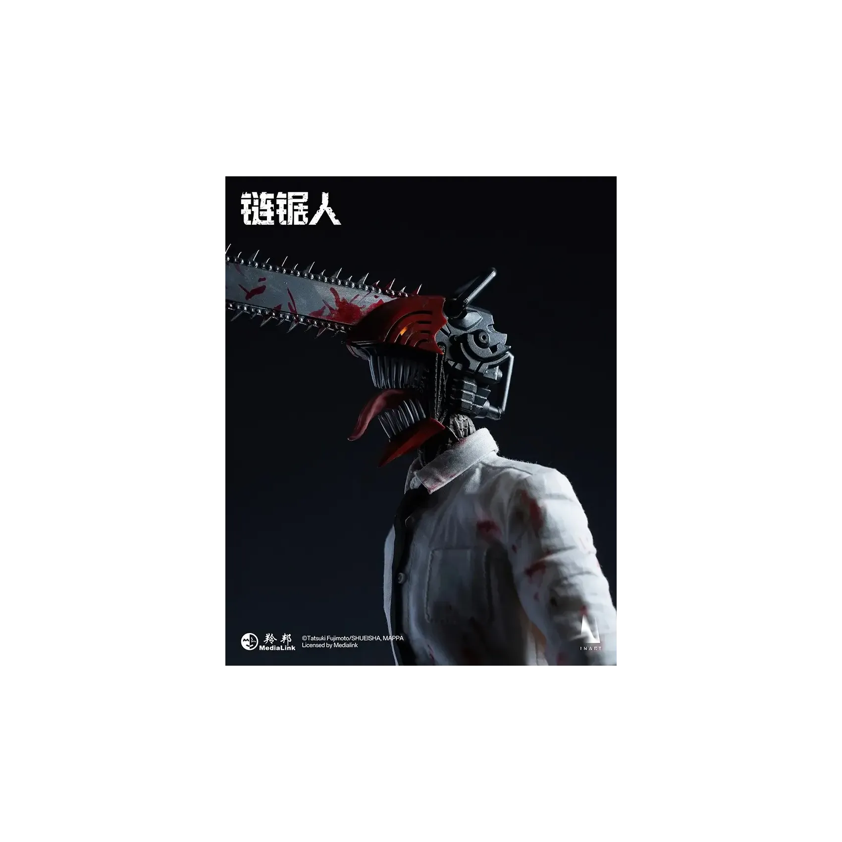 INART poseable body*1, magnetic light-up chainsaw head*1, blood-stained shirt*1, tie*1, pants*1, shoes*1 pair, interchangeable short mandible*1, interchangeable long mandible*1, open chainsaw hands*1 pair, clenched chainsaw hands*1 pair, magnetic blood effect head piece*1, blood effect head piece*1, blood effect hand pieces*2, metal stand*1, base*1.
