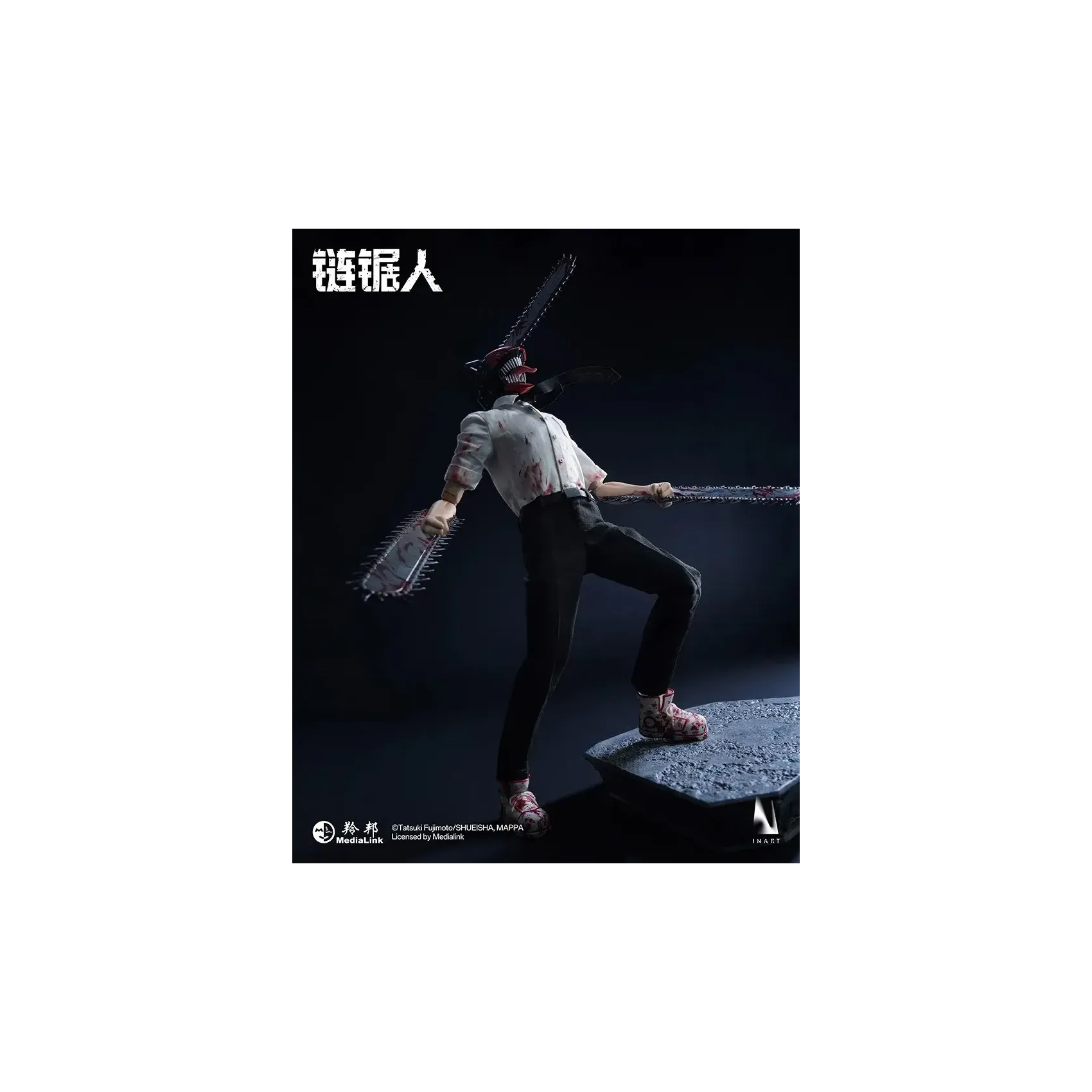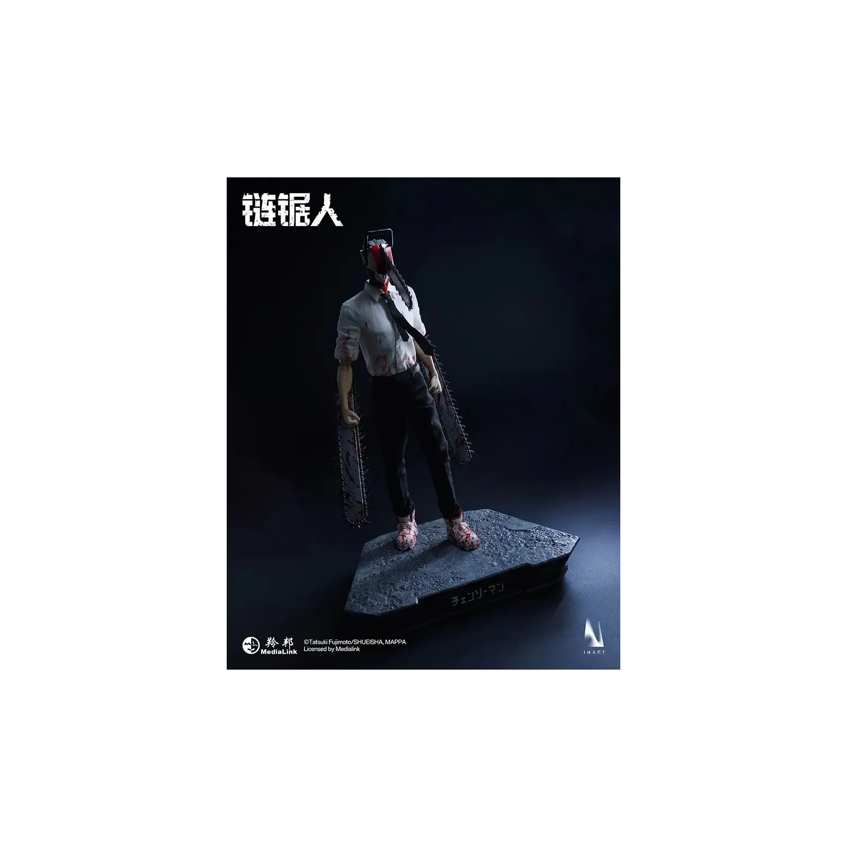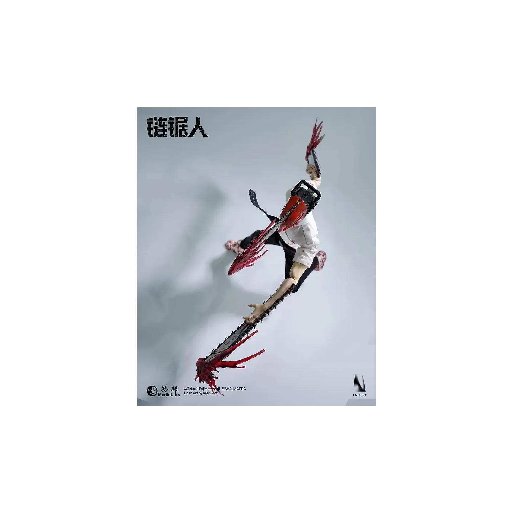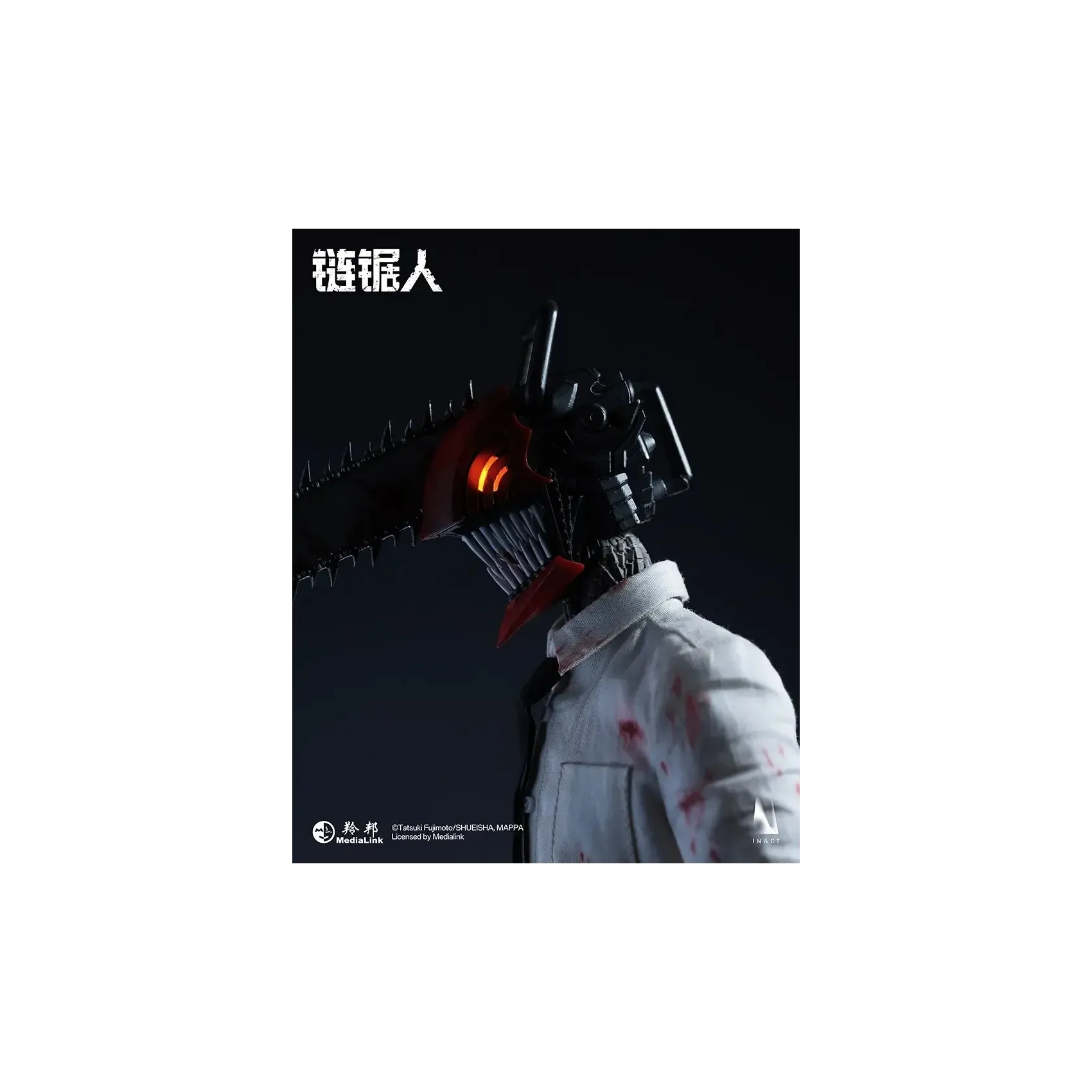 INART poseable body*1, magnetic light-up chainsaw head*1, blood-stained shirt*1, tie*1, pants*1, shoes*1 pair, interchangeable short mandible*1, interchangeable long mandible*1, open chainsaw hands*1 pair, clenched chainsaw hands*1 pair, magnetic blood effect head piece*1, blood effect head piece*1, blood effect hand pieces*2, metal stand*1, base*1.