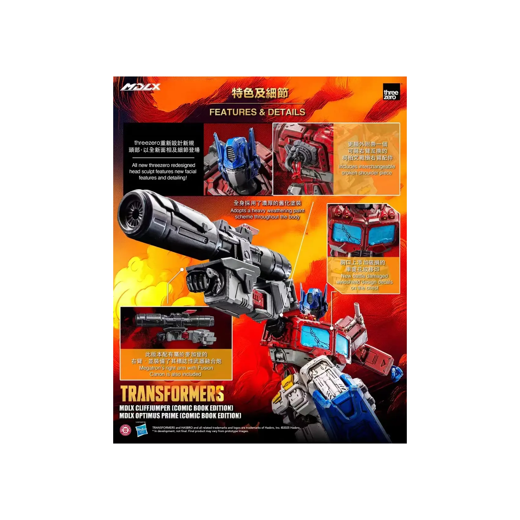 Includes interchangeable broken shoulder piece of Optimus Prime and a Megatron’s right arm with fusion cannon